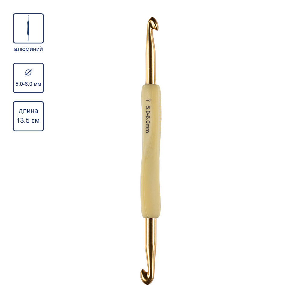 Крючок двухсторонний " Gamma" RHD алюминий d 5. 0 - 6. 0 мм 13. 5 см в блистере. Двухсторонние алюминиевые крючки с прорезиненной ручкой идеально подойдут тем, кто много вяжет. Двусторонние крючки – это два размера в одном, отличный способ сэкономить, занимают меньше места при хранении. Крючки комфортно лежат в руке за счет эргономичной ручки с ребристой поверхностью под пальцы. Благодаря прорезиненной эластичной ручке, крючки не выскальзывают из рук, на пальцах не образуются мозоли. Удобная форма головки легко захватывает нить. Длина головки - 3. 5 см. с двух сторон. Длина ручки - 6. 5 см. Сообщить о неточности в описании