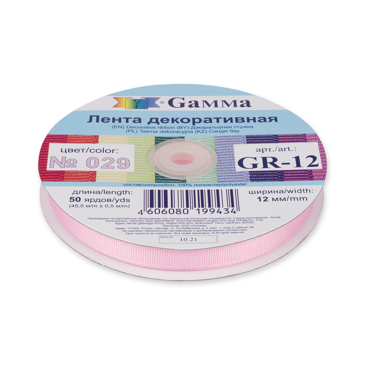 Тесьма декоративная "Gamma" репсовая GR-12 12 мм 1/2 " №029 бл.розовый 45.5 метров